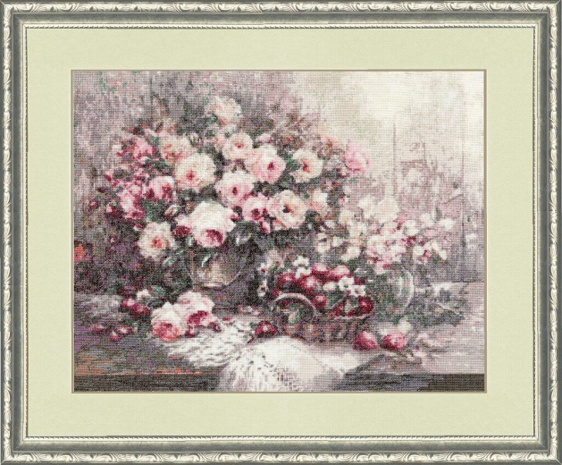Оформление - двойной багет, музейное стекло. Хочу сказать большое спасибо фирме "Золотое Руно" за комплектацию набора и лично дизайнеру Есеновой Индире за разработку этого сюжета! Вышивка очень нежная, цветовые переходы подобраны идеально, нет ни одного одиночного крестика! Мои затраты на вышивку - 395 вышивальных часов, это время удовольствия от каждого крестика и эйфории от готовой работы! К сожалению, фото не передаёт всей прелести и нежности этой картины...